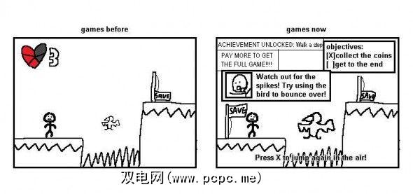 If Mario came out today, the first level would consist of tips like, “press A to jump” and “that turtle is bad, you should not let him touch you.” Common sense should tell you that the turtle is bad, but that just is not enough for most modern games. When I played Mario I was somewhere around 4 years old, yet I managed to brute force my way through it. I learned as I went, and I figured out how to beat the game.