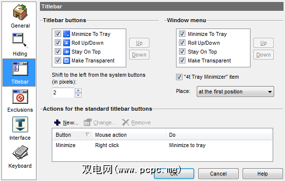成功安装4t Tray Minimizer后,您将在打开的窗口的标题栏中看到多达四个其他按钮。 。从左到右,这是他们的工作:最小化窗口到系统托盘,卷起窗口,固定窗口始终在顶部,使窗口透明。
