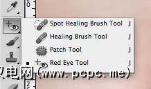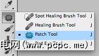为解决变色,我们将使用补丁工具。您可以在“斑点修复刷工具"和“修复刷工具"下面找到它。