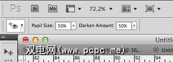 红眼工具位于斑点修复画笔工具和修复画笔工具下方。选中“红眼工具"后,工具栏中将出现两个有趣的选项:“瞳孔大小"和“变暗量"。您会发现,Photoshop通过使瞳孔变暗消除了红色的眩光。根据瞳孔的眩光量和大小,您可能需要尝试一下。