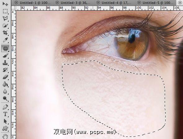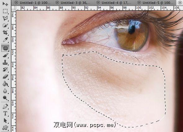 用手中的补丁工具,选择袋子的区域。您需要使用光标绘制选择区域。小心不要遮住睫毛。