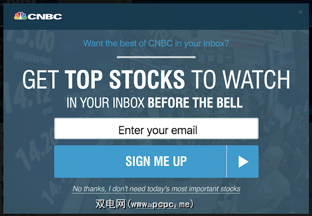 您可以专心阅读文章(I '已经注意到编程,个人理财和创业博客是屡犯者,只是出现了一个巨大的叠加层,要求您注册其邮件列表。更糟糕的是,许多人将“关闭窗口"按钮替换为一些消极的攻击行为,例如“ 不,我不想成为一个更好的程序员",“ 我不想节省更多的钱",或者对于CNBC,“ 不用了,我不需要今天最重要的股票。"。