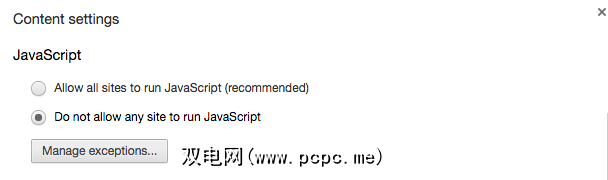 唯一真正的方法是禁用JavaScript。在Chrome浏览器中,您可以点击设置,然后点击显示高级设置。在内容设置下,您会看到标有 JavaScript 的标题。选中“不允许任何网站运行JavaScript "框。