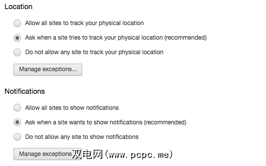 您可以通过对浏览器进行一些修改来消除这些请求。在Chrome中,依次点击设置和高级设置。在隐私下,点击内容设置。然后,在位置下,选中“ 不允许任何站点跟踪您的实际位置"。 下面是通知,您应在其中选中“不允许任何网站显示通知" 。
