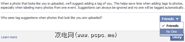此外,您可以控制< em>上传看起来像您的照片时谁会看到标签建议。这很关键,因为Facebook拥有功能强大的人脸识别软件,该软件可以根据您标记了脸部的旧照片在新照片中识别您。如果您不想自动被标记,请将其设置为没人。