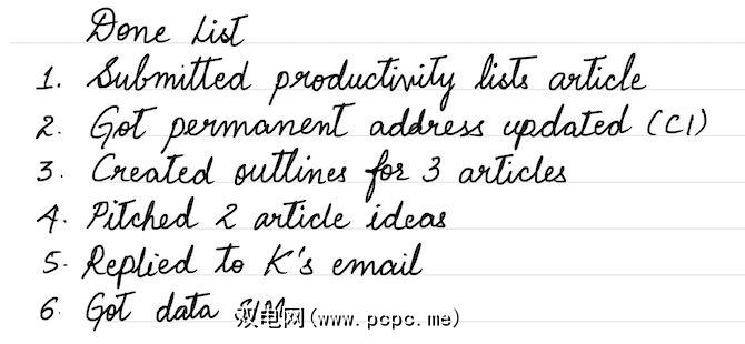 如果您勾选了这些,则可以确保完成三件事。但是,如果您写下来,您还回答了两个有关营销预算的电话,列出了潜在的应聘者名单,发送了六封有关项目批准的电子邮件,并在回家的路上捡了一些杂货,那么您将看到如何您已经完成了很多工作。