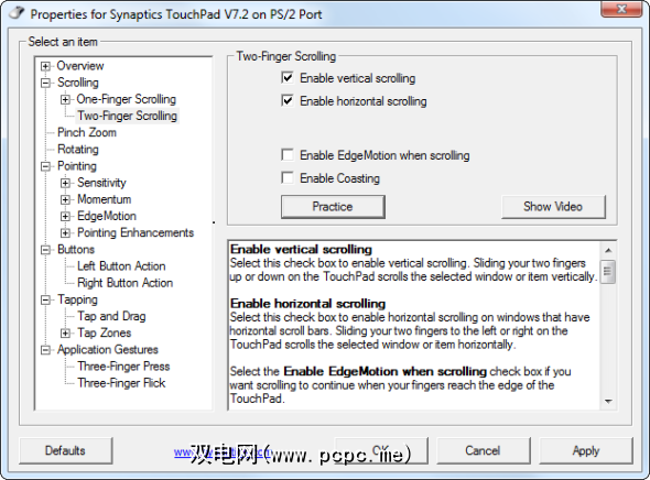 您会找到一个窗口,其中包含用于配置触摸板和使用各种不同操作的选项,并带有“ Practice"(练习)按钮和“ Show Video"(显示视频)按钮,这些按钮可让您练习手势确切地说它们是如何工作的请记住,您看到的确切选项将取决于您的触摸板,因此每台计算机将具有不同的选项和可用的操作。