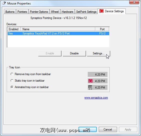 在“鼠标属性"窗口中,单击到“设备设置"选项卡,然后单击“设置"按钮以开始配置触摸板。