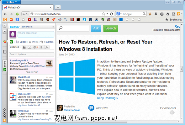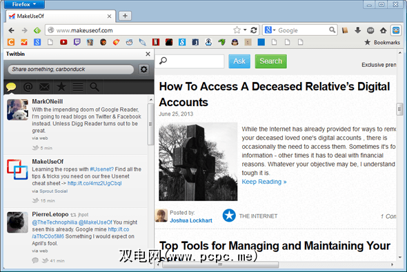 Twitbin正式称为“ Twitter侧边栏"适用于Firefox",但在我看来,这还不止于此-它是Firefox中的整个Twitter客户端。安装后,您会在Firefox搜索工具栏上看到一个Twitbin按钮,单击该按钮将打开Twitbin侧栏。此侧边栏非常干净,快速且设计合理,因此您可以轻松阅读Twitter提要并发布推文。
