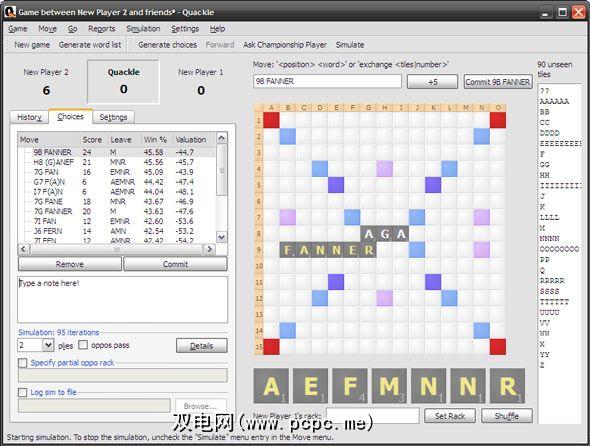 Quackle列出了所有可能的字母移动方式并告诉您哪些举动可能会给您最高的分数。见左边的那些。就像国际象棋一样,Quackle还会分析和计算棋盘上一组特定图块的所有假设的未来移动。 Quackle通过根据前方或后方的点数以及游戏中还剩下多少分牌来猜测当前玩家获胜的机会来估算每个玩家的获胜百分比。所有这些都很复杂-也许此流程图将帮助您了解Scrabble帮助程序的人工智能。观看界面底部的提示和说明。