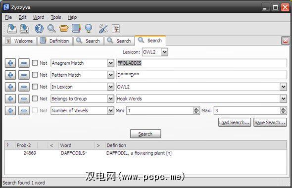 该程序在首次运行时会加载字典。接下来,您决定如何使用Zyzzyva –作为字谜解密; Zyzzyva有一个功能强大的单词搜索工具,可用于使用词典查找与某些条件匹配的所有可接受的单词。如下图所示,您可以添加条件以微调您的单词搜索。