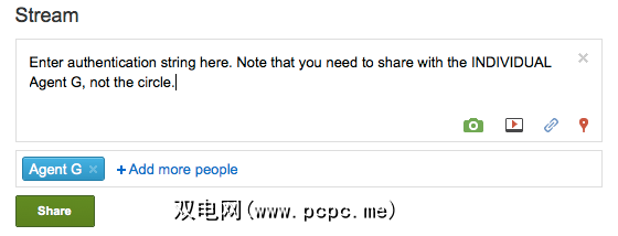 在Google+中,为Agent G创建更新(作为个人,而不是圈子),并将此身份验证字符串作为文本提交。