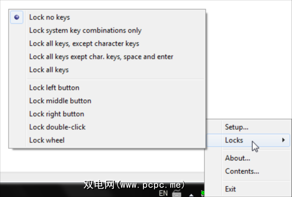 使用Kid-Key-Lock,您可以仅锁定鼠标左键,锁定右键,锁定方向盘和左侧等等。您可以选择任意组合。还有一些用于锁定键盘的选项,例如仅锁定系统组合(Ctrl,Alt,Win组合),锁定除字符键之外的所有键等等。这真的很方便,因为这意味着您可以(例如)让某人使用键盘键入某些内容,但不执行其他任何操作。