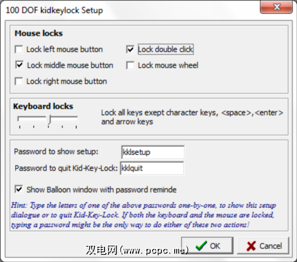 这些选项不是很好,但很有用。您可以设置您可以随时键入的密码(即使键盘被锁定),这将加载设置或退出程序。这些很重要,因为如果您决定锁定所有键和所有鼠标按钮,它们是您的唯一出路。幸运的是,Kid-Key-Lock可以检测到您何时开始输入密码并提醒您完整密码。