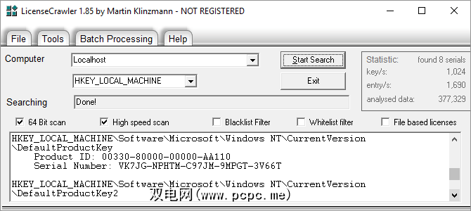 将其指向 HKEY_LOCAL_MACHINE 搜索序列号。扫描是彻底的,并且比任何其他工具都要花费更长的时间。扫描完成后,进入文件菜单以保存或加密结果。在“工具"下,您还可以对LicenseCrawler转储进行解码或编码。