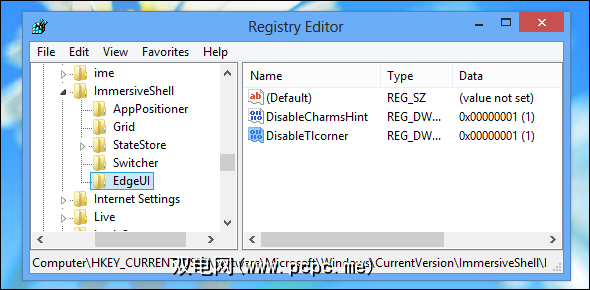 在ImmersiveShell密钥下创建一个名为 EdgeUI 的新密钥。在EdgeUI下,创建一个新的DWORD值,将其命名为 DisableCharmsHint ,并将其值设置为 1