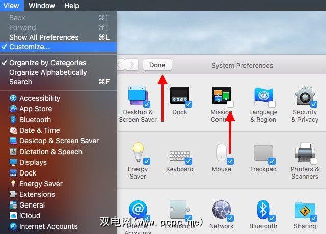 2。取消整理“系统偏好设置"对话框。您是否有某些从未涉足的部分?如果是,请导航至查看>自定义,取消选中它们旁边的框,然后单击完成。。这将隐藏那些未使用的部分,并为您提供了更干净,更容易搜索界面。