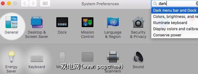 1。使用关键字搜索。假设您想切换到深色菜单栏,但是您不知道哪个部分拥有该设置。这就是你的工作。在右上角谨慎的搜索框中开始输入深色菜单栏。您会看到一个动态的相关匹配下拉列表,包括黑暗的菜单栏和停靠栏。