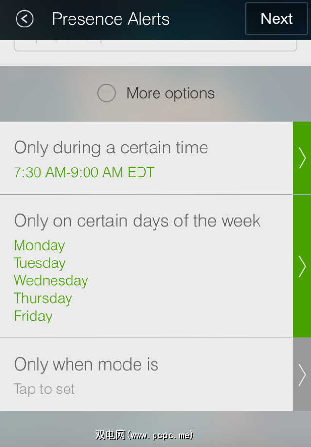 在这里,您首先要规定您只想收到有关离开的通知,因为您想跟踪孩子何时离开家,以及是否要以短信提醒还是常规的智能手机通知方式接收他们。然后,选择更多选项,以深入了解SmartThings系统提供的一些更细微的调度功能。