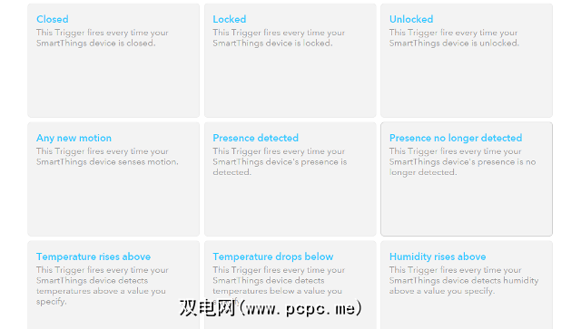 转到我的食谱,然后创建食谱。在触发频道下的搜索框中输入“ SmartThings",然后将其选中。然后,从交互列表中找到不再检测到状态。从下拉列表中选择 SmartThings Presence ,然后单击 Create Trigger 。