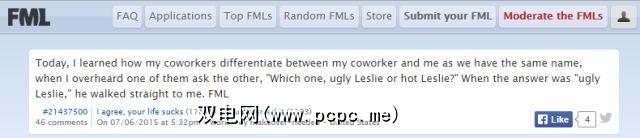 含义:虽然它已经很老了,但仍然使用了很多。这个想法是,当您遇到不幸的事件时,请用“ FML"标记它与世界分享。简单。实际上,这实际上是一种治疗方法,特别是如果您想在FMyLife这样的地方匿名承认自己的不幸,这是从真实的人那里读真实故事的最佳网站之一。