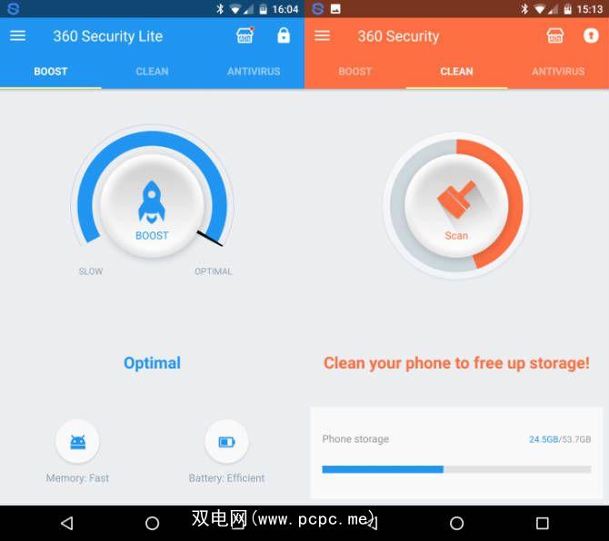 从Google Play下载360安全性后,您会发现它不需要任何设置。只需弹出该应用程序,您将找到它的三个主选项卡- Boost , Clean 和 Antivirus 。