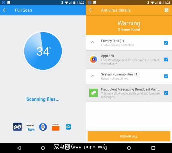 要测试防病毒,我在手机上进行了全面扫描。扫描屏幕上有一个类似雷达的圆圈,显示完成百分比,而来自设备的随机应用程序图标则显示在扫描仪下方。该应用程序在我的设备上发现了两个“问题"。