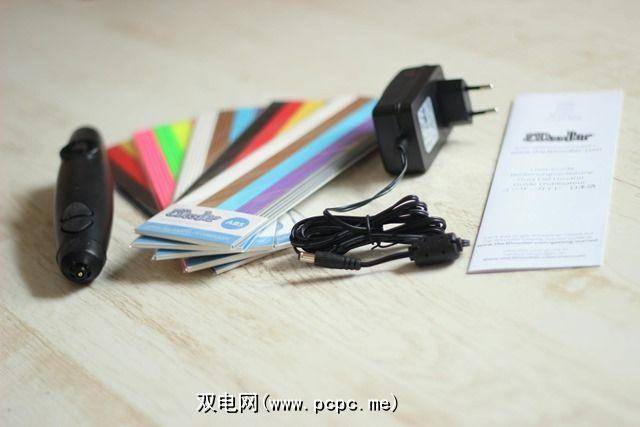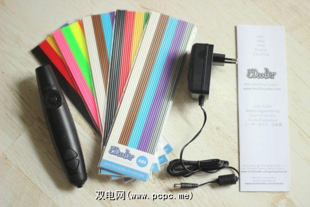 3Doodler看起来有点像普通的笔,除了大小,内置风扇,电源插头以及您用塑料细丝装入之外。包装盒中包含笔本身,电源和一些塑料。