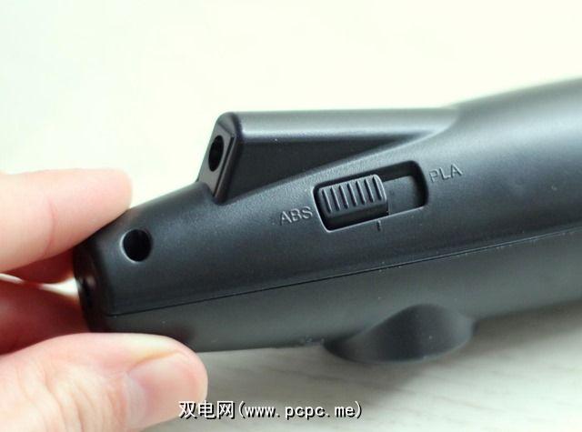 在笔的侧面,您会找到电源开关。这不是简单的开/关按钮,而是一个塑料选择器。笔关闭时,按钮位于中间位置。启用它后,您需要选择要使用ABS还是PLA。 3Doodler的温度会根据您使用的塑料类型而变化,因此选择合适的塑料很重要。