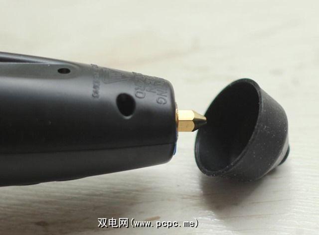 在笔的背面可以放置塑料。细丝安装在背面的孔中,并一直到达尖端,在此处熔化。笔的背面也是可以找到电源插座的地方。