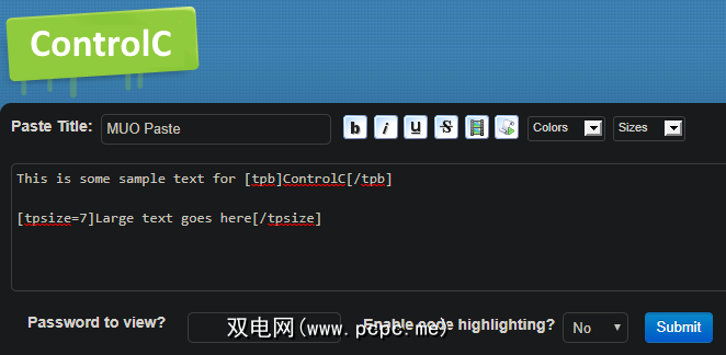 以前称为Tinypaste,此pastebin网站使共享死亡变得简单。输入粘贴的标题,然后有几种格式设置文本格式。您可以使用粗体,斜体,下划线和删除线文本,以及启用代码突出显示。另外,ControlC支持添加视频,以及更改文本的颜色和大小。