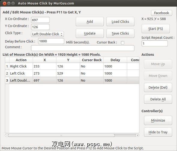 使用该软件,您可以创建自己的宏(有关控制光标坐标,所需的单击类型(不仅包括左键和右键单击,还包括虚拟按住键盘按钮时的单击)以及每条指令之间的延迟。该应用程序还允许您重复多次宏,以及隐藏到托盘中。