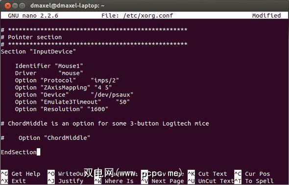 向下滚动,直到找到读取“ InputDevice"部分的行。在此之下,您会找到几行 Identifier , Driver 和 Option 行。在最后一个选项行之后,插入以下内容:选项“ Resolution"“ 1600" 。这条线将鼠标的分辨率提高到每英寸1600像素或更小,具体取决于鼠标支持的最大分辨率。尽管在整个屏幕上都有提高的速度,但是更高分辨率可以使光标保持准确。