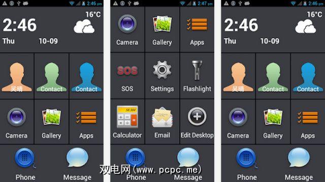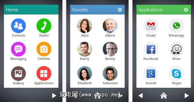 拨号器和文本按钮始终在主屏幕底部可见,而一行喜欢的联系人行顶端。下面是相机,图库,手电筒,SOS按钮和应用程序抽屉。