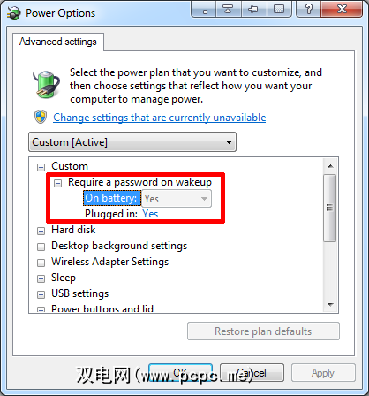 从Windows 7开始菜单中搜索并打开> Power Plan ,然后单击>更改计划设置。 在您当前的电源计划中,点击左下方的>更改高级电源设置。展开“电源选项"高级设置中的第一项,然后选择>是。单击>确定和>保存更改。