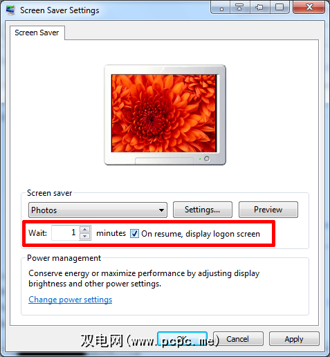 在返回桌面时设置密码在屏幕保护程序中,右键单击您的桌面,然后选择>个性化。点击右下角的>屏幕保护程序。在“屏幕保护程序设置"中,选中>恢复时,显示登录屏幕旁边的框。单击>应用或>确定保存更改。