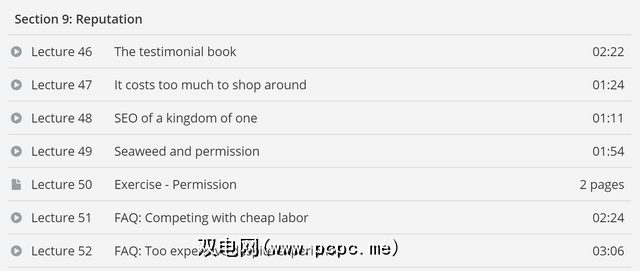 您会发现一些特定主题,包括如何与客户打交道,可以使用的策略,为产品或服务定价,建立声誉,提升自己以及各种其他东西。它有87堂讲座,每一篇都涉及自由职业者生活中的一个重要方面。