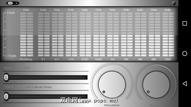 除了10波段外,您还将找到一个虚拟器和一个混响拨盘,以及一个用于低音增强和高音增强。