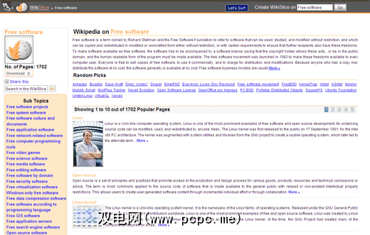 Wikislice是允许用户根据特定主题或子主题整理Wikipedia条目的应用程序。顾名思义,Wikislice以可下载的格式为您提供信息的“切片",以便于离线阅读。 Wikislice是基于Web的工具以及桌面界面。要使用Wikislice,只需在提供的搜索栏中键入您感兴趣的主题,Wikislice就会显示所有适用的信息供您浏览或下载。
