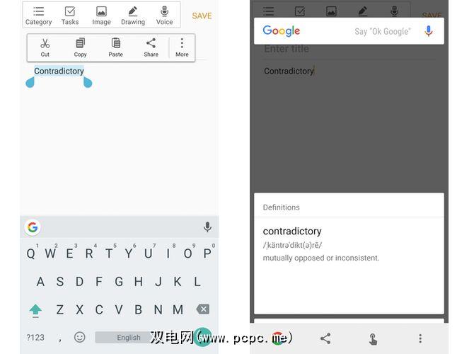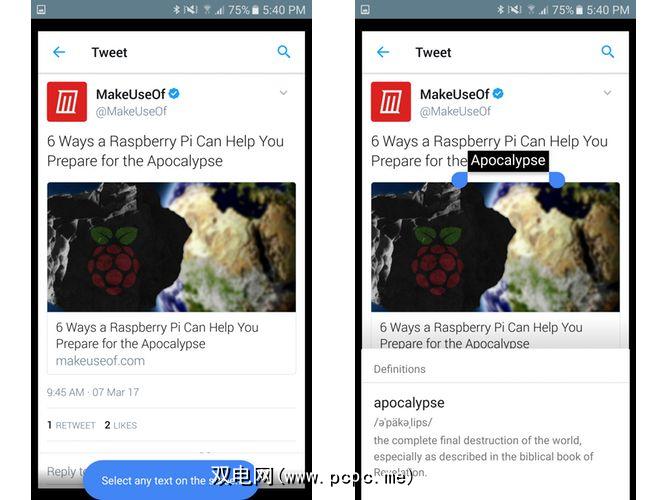 iPhone和iPad具有内置的字典,可以通过突出显示一个单词并点击“定义"按钮来调用它,而Android则没有类似的功能。虽然如果您使用Now on Tap,则可以获取单词甚至整个短语的定义。