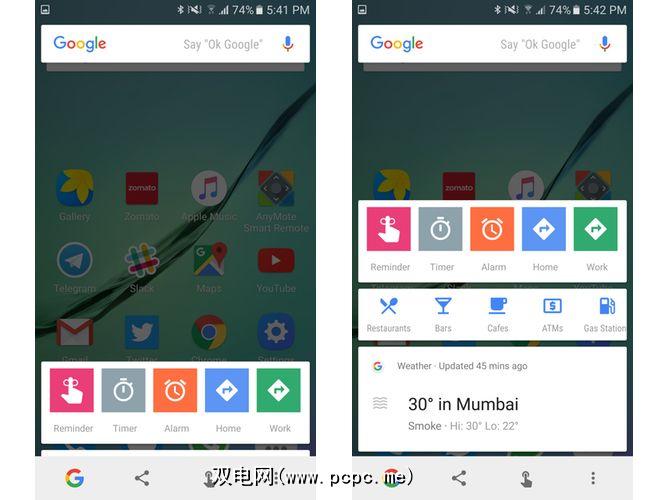 iOS具有Control Center,它是一组通用的切换器和快捷方式,可用于常用的应用程序,例如计算器或时钟。但是,在具有Now Now的Android设备上,如果您按住Home键,您将看到创建提醒,添加日历项,设置闹钟或开始周转的快捷键