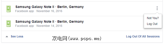 更改密码后 >,然后向上滚动至您登录的地方。通过单击三个垂直点来注销各个会话,或在扩展列表后单击右下角的注销所有会话选项。 仅在确定可以重新登录后才执行此操作。