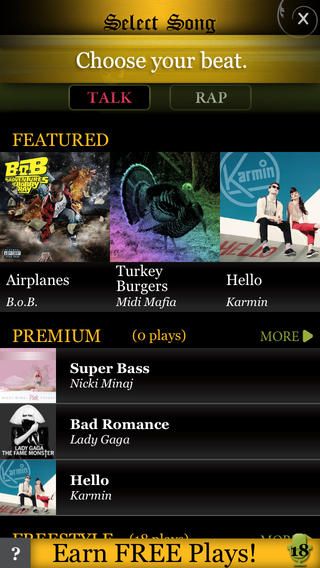 此应用程序放弃了所有自动帮助功能,只剩下您自己的技能去做这项工作。这是您与他人一起练习后毕业的应用程序。该应用程序带有许多节拍,可让您吐出音乐流,并且作为额外的奖励,您甚至可以对手机中存储的音乐进行说唱。