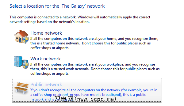 连接到新的公共网络后,请确保在出现以下情况时告诉Windows该新网络属于公共类别:会出现相应的选择窗口。