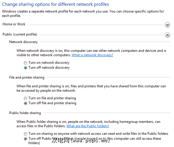 要控制您的共享设置,请转到控制面板,然后单击>网络和Internet >网络和共享中心>更改高级共享设置(左侧菜单)。打开公共配置文件并关闭所有共享选项。