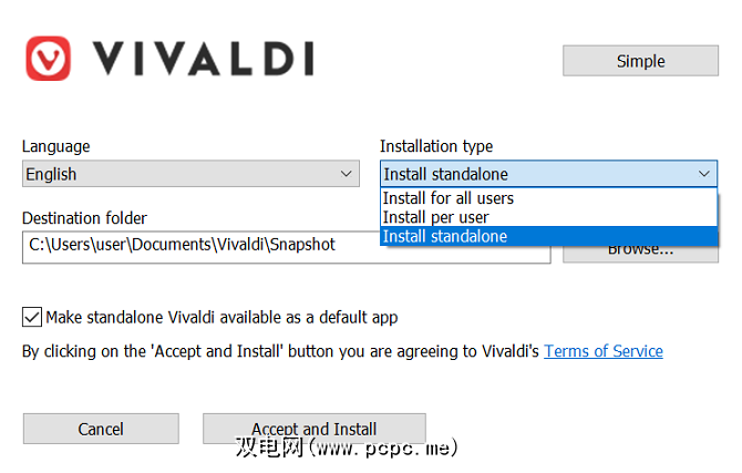 Vivaldi可以作为便携式浏览器部署在USB驱动器。但是,这次,用于创建独立版本浏览器的选项已编码到主应用程序的安装程序中;没有单独的下载。