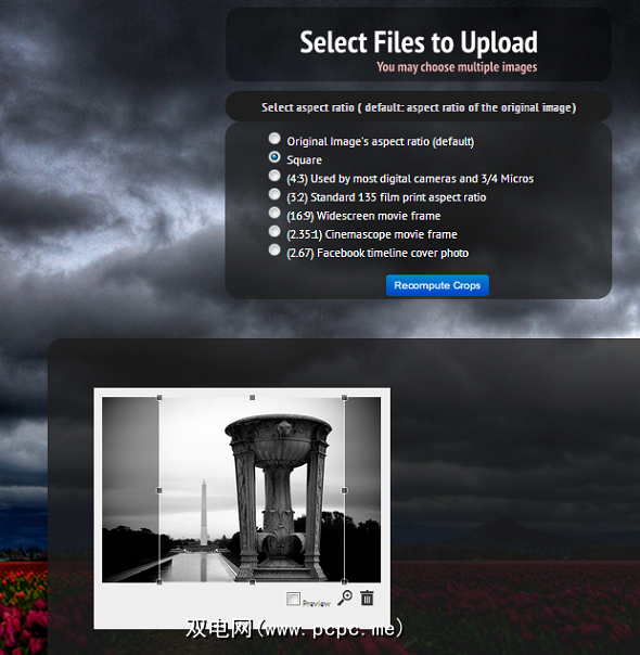 将图像上传到Croppola,并选择新裁剪图像的尺寸-选项包括保持图像的纵横比,正方形,4:3、3:2、16:9等。它甚至可以将图像裁剪到Facebook时间轴的封面照片上。