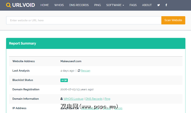 最后,还有URLVoid,一个可帮助您“检测潜在恶意网站"的工具。与其他工具一样,只需输入可疑URL并等待站点检查一下。您将找到有关URL及其历史记录的信息,任何黑色的勾号,以及该信息是否已公开的网站的所在地。