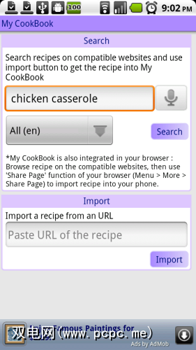 您首先单击“ 搜索并导入"。搜索屏幕使您可以在Internet上的其他食谱站点中搜索食谱。当您找到喜欢的书时,可以将其导入“我的厨师"。如果您已经知道食谱的URL,请将其输入URL字段,然后My CookBook会尝试自动导入食谱。