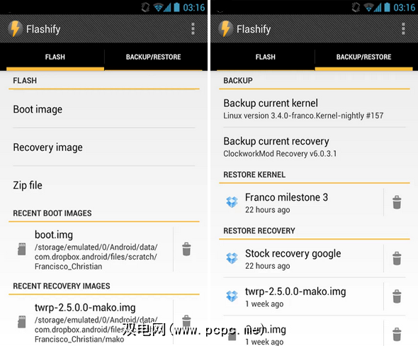 Flashify是经过测试并确认可以工作的较新ROM管理应用程序对于Galaxy Nexus,Nexus 4,Nexus 7和Nexus 10,所有其他设备均受“自担风险"政策的约束,但在大多数情况下,它们应运行良好。 Flashify具有我真的很喜欢的漂亮界面,并且它具有很多功能。